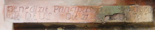 Благословив початок і заопікувався закінченням Бог ____ Дня 27 серпня 1765 (або 1769?) | мабуть, ідеться про ремонт будинку (збудований він був раніше). Напис досить сильно пошкоджений. Прочитання F[inemque] мені підказав raw_stick (див). Наступне ж слово читаю Coravit і розумію його як неправильно написане Curavit (пор. ідентичну описку на Будинку-Календарі на Вірменській: convivia corant в останньому написі замість curant). До такого прочитання також схиляє те, що C тут виглядає ніби більшим за наступні літери - що би мало вказувати на те, що то є початок слова (всі слова в цьому написі починаються з великої літери). А також і те, що, коли прийняти F[inemque], то важко після нього ще щось вмістити перед згаданим С. |
